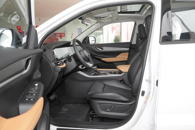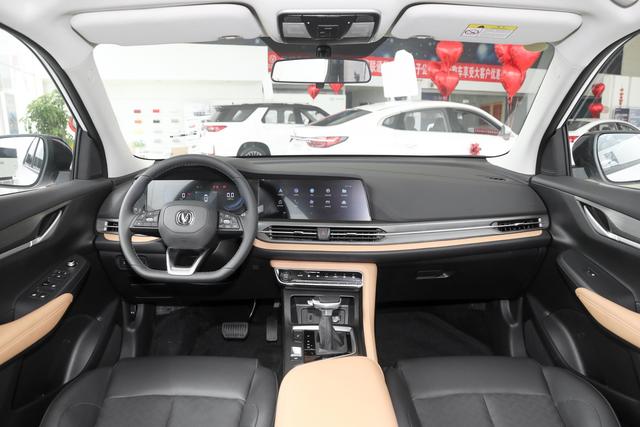 进入到前排,中控台配有双联屏,看着有科技感。中控台上面使用软塑材料覆盖,下面用硬质饰件装饰,驾驶舱周围还使用暖色皮革包裹,看着温馨。