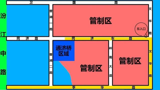 如图所示,黄色路线为行通济路线,绿色路线为应急救援通道,红色区域为管制区域。