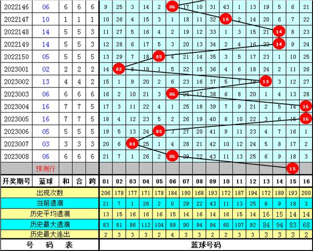 双色球第2023008期蓝球号码为06,上升3个点位,前10期蓝球号码大小比为4:6,前5期蓝球号码升降走势为:上升10点→重号→下降11点→下降2点→上升3点,本期注意蓝球上升,参考大号蓝球15。
