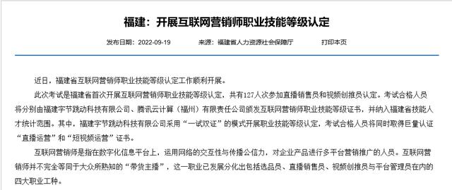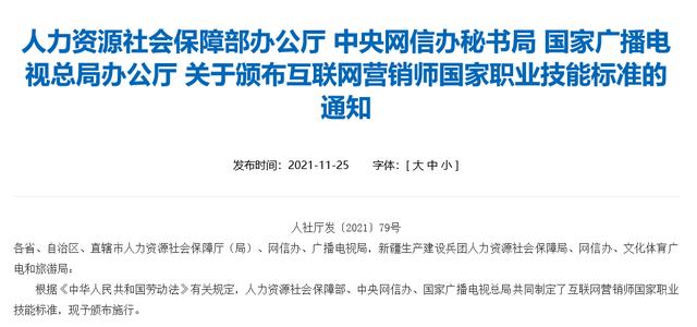 1、互联网营销师是在2020年由人社部联合国家市场监管总局、国家统计局发布的9个新职业之一,被纳入《国家职业分类大典》,在2021年底发布了职业标准。2020年6月,人社部指定「中国轻工业联合会」作为互联网营销师国家职业标准制定的承担单位,「中国轻工业联合会」又指定「中国轻工企业投资发展协会」为职业标准的主笔单位。