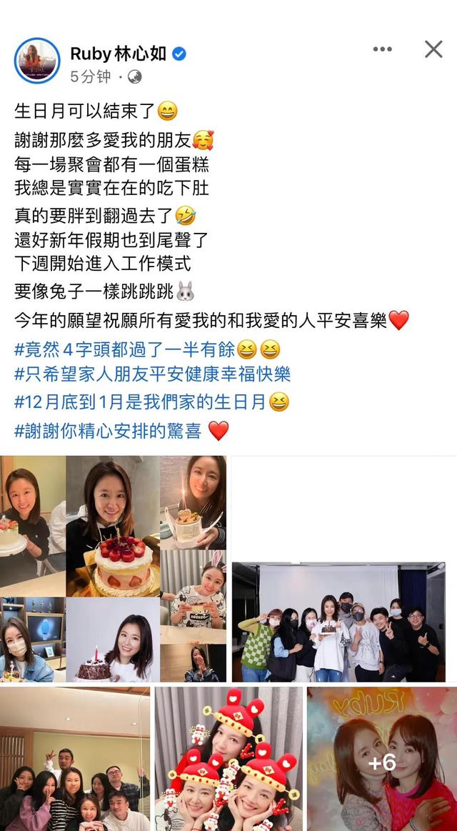 林心如感慨,这次过生日吃了好多次蛋糕,有和好友舒淇和林熙蕾的合照,还有和工作人员的合照,家人的合照。