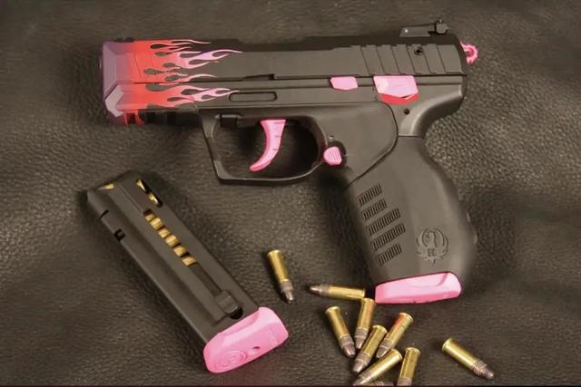 这种SR22P手枪的主体外观为玫瑰金色涂装,配备明对比明显的黑色聚合物握把,套筒上方的准星和照门、枪身后方的镂空击锤以及手动保险、空仓挂机解脱杆、扳机、弹匣卡笋等操作部件也都如同握把一样采用黑色涂装,以搭配主体色调形成色差来吸引签了潜力购买者。