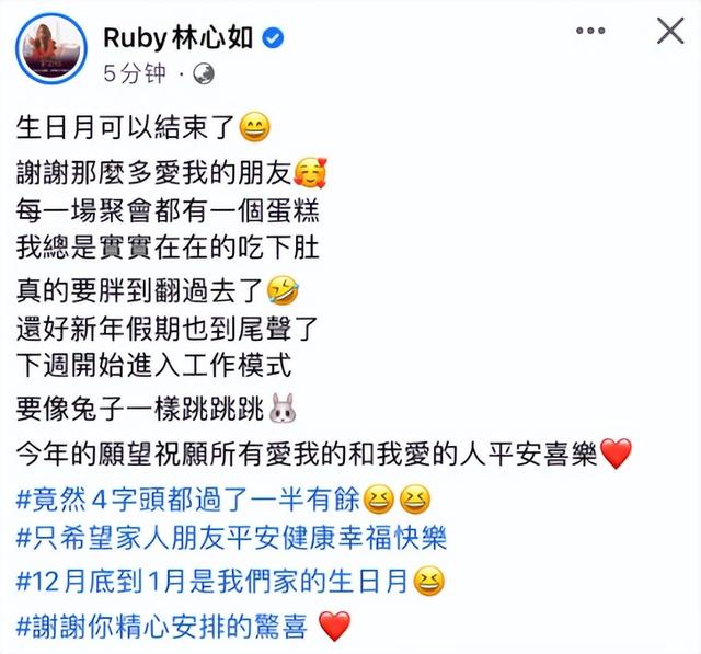 1月28日,林心如在个人社交平台上晒出大量庆生照,庆祝自己的47岁生日,她直言,这个生日过得非常幸福,感受到了很多亲朋好友的爱意,春节假期结束了,接下来就要开始进入到工作模式,最后,林心如还希望所有她爱的人都能够平安幸福。