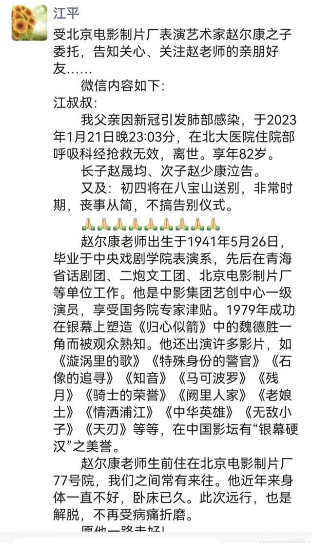不幸的是,2023年1月21日晚23时03分,这位德艺双馨的表演艺术家因感染新冠引发肺部感染,在北京去世,享年82岁。