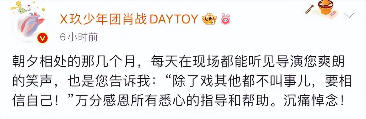 其中,肖战写道:朝夕相处的那几个月,每天在现场都能听见导演您爽朗的笑声,也是您告诉我:“除了戏其他都不叫事儿,要相信自己!”万分感恩所有悉心的指导和帮助。沉痛悼念!