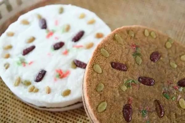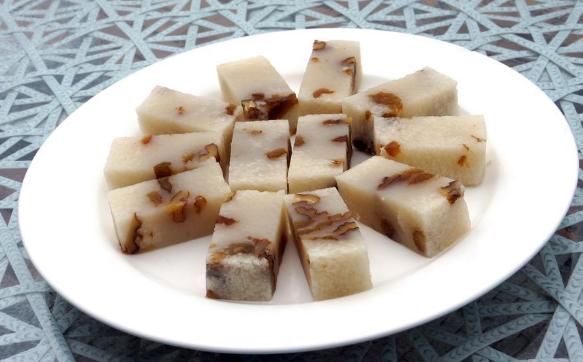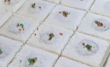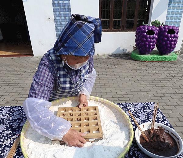 “四喜风糕”是宝山罗泾的特产,以当地优质稻米为材,粳糯搭配浸泡后沥干,磨细成粉,加糖水拌和,筛滤成料装入模具,于笼屉内蒸成。