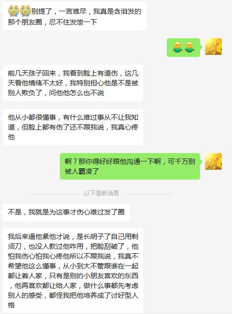 原来,孩子已经进入青春期,身体开始发育了,胡须也长出来了,由于从小没有爸爸,没有人教过他男孩青春期应该怎么度过、剃须刀应该怎么用,他害怕妈妈心疼他,有话也不敢问妈妈,于是自己用剃须刀,把脸刮破了。