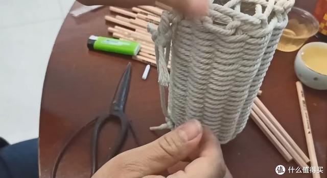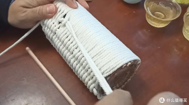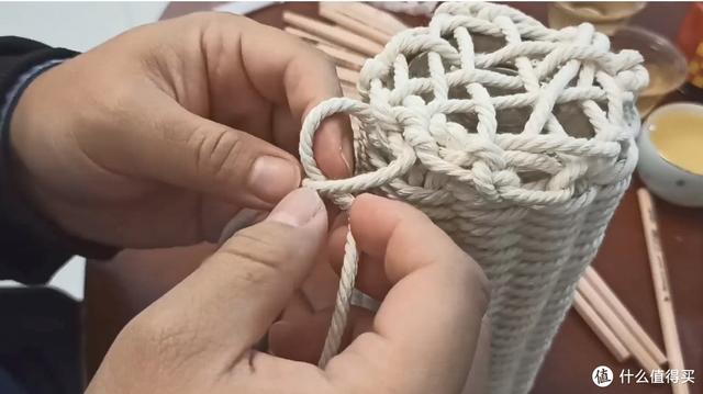 打个结以便固定以后,在底部交叉穿梭,形成杯套的底。