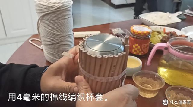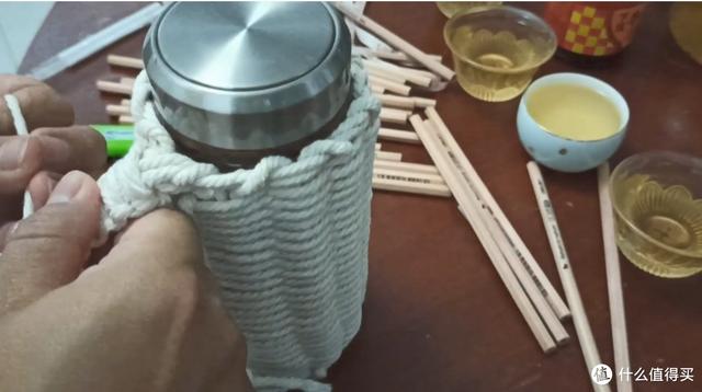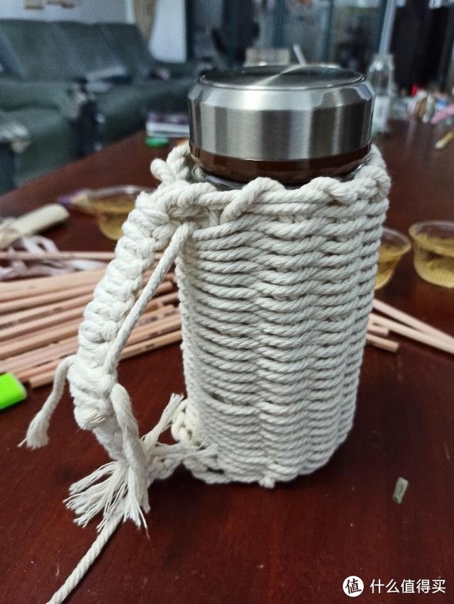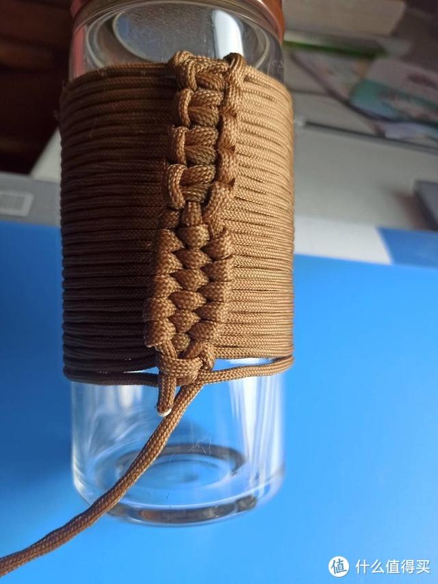 就像给杯子穿防弹衣,用七芯伞绳给杯子编织杯套,有一个小缺点,就是温度高的时候会散发出一种塑料味或者是小小的异味。于是这次用棉线编制了一个。