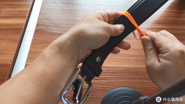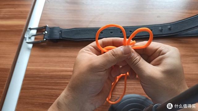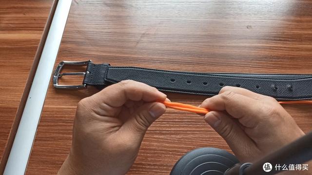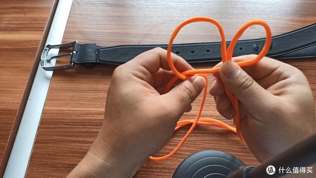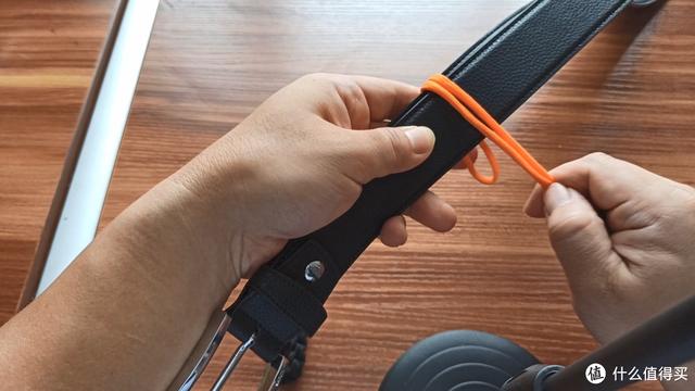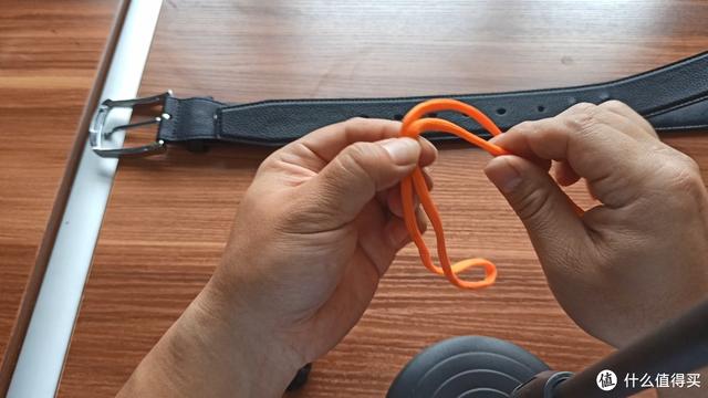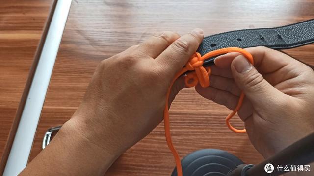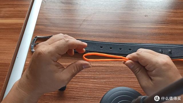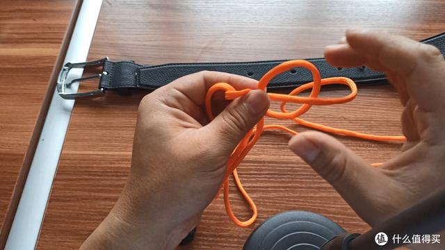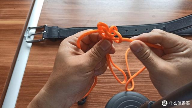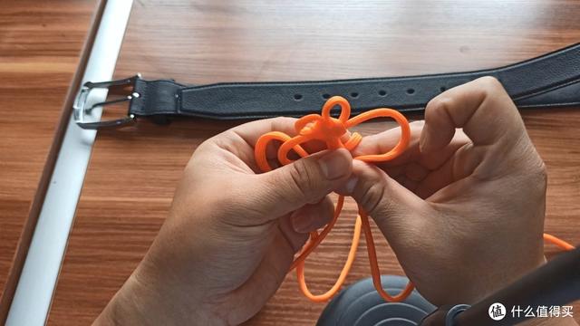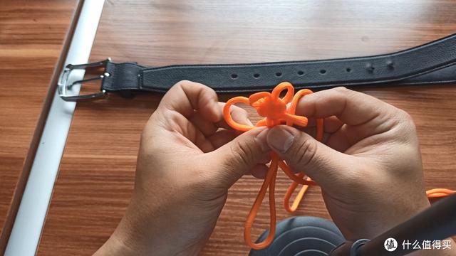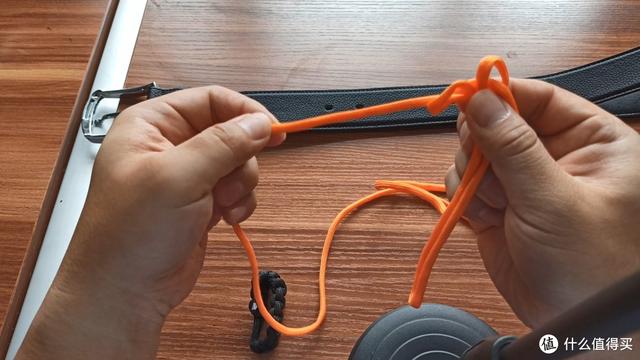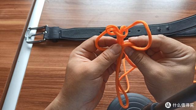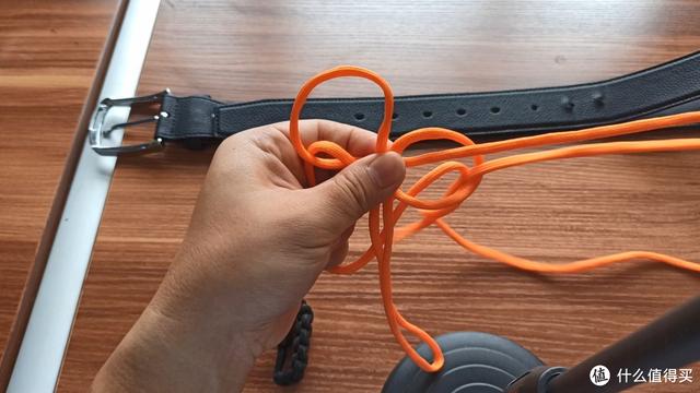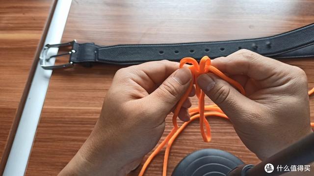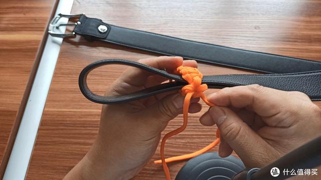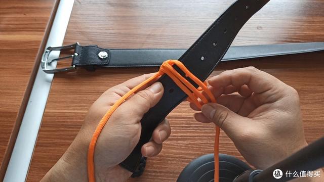 将腰带对折后,把伞绳围着腰带绕一圈。
