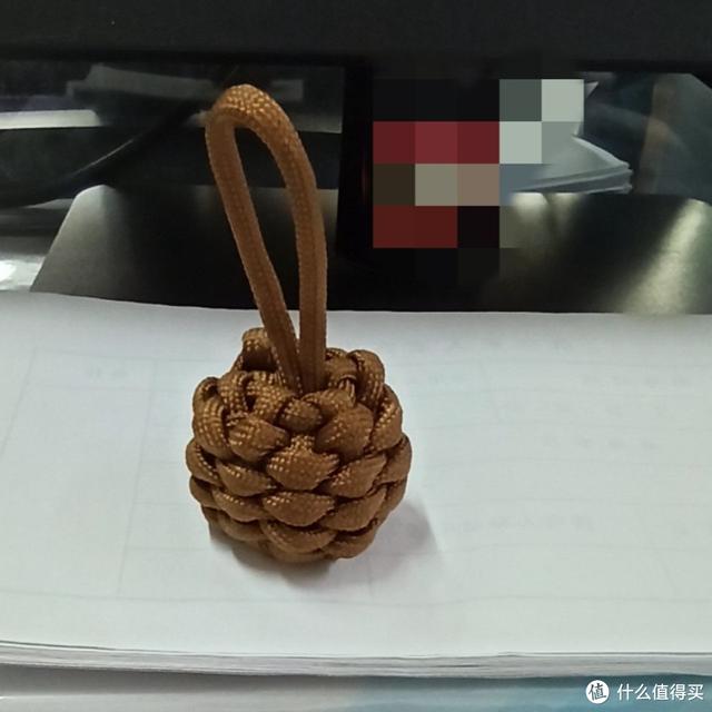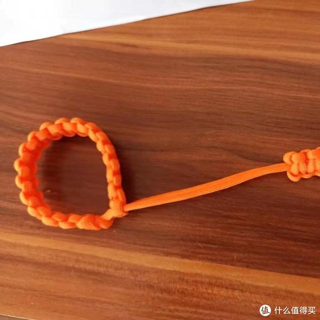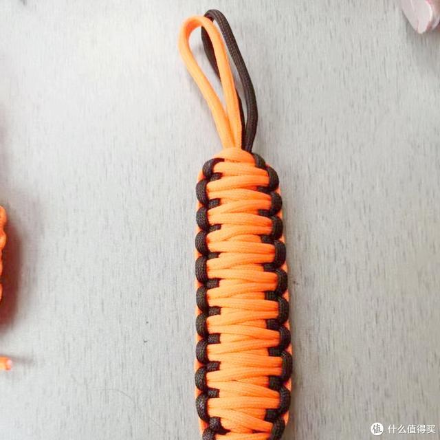 这个是用橙色和黑色双色伞绳编织的阿柒令牌。只能说想象中有点像。编得很是认真,硬邦邦的很难得掰动。