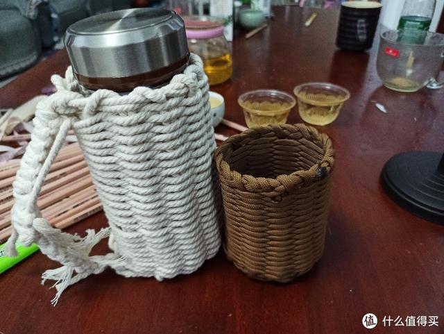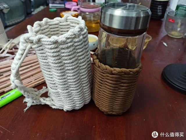 下图是还没有泡水的棉线编织杯套和以前狼棕色新伞绳编织杯套对比。