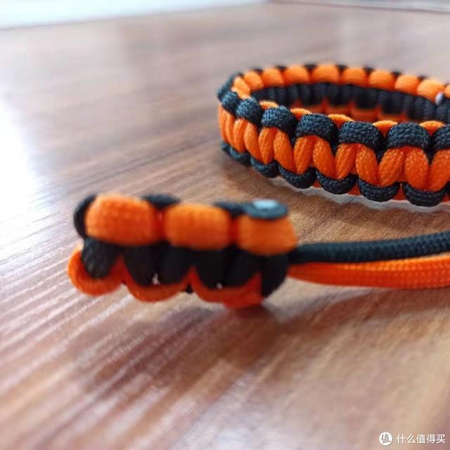 这是用橙色的七芯伞绳编织的手链,可伸缩。