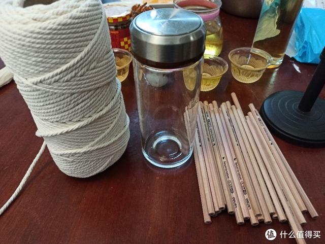 铅笔和杯子本体都准备好了。再前面是泡好的几杯白茶,准备编织过程中喝。事实上根本就不记得喝。