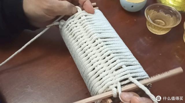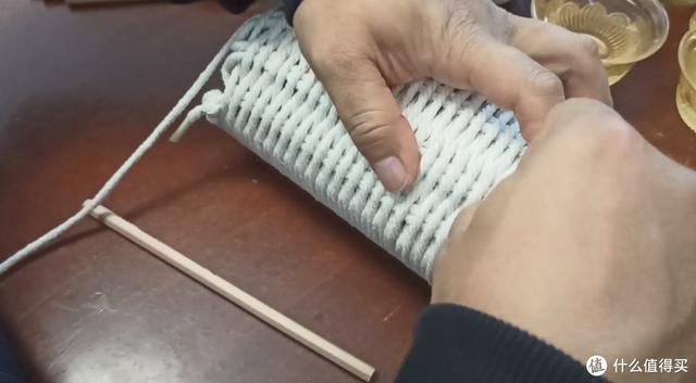 依照剩余棉线的长度,上上下下、循环往复的编把手,越编越硬。
