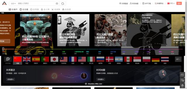 我们可以按照时间轴、关系图谱、时间地图查看各国,各个历史时代的历史相关内容。另外,它还给予我们查看搜索全画作、全古籍、全人物、全战争、全古籍等内容。