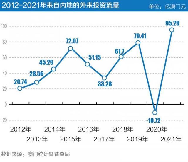 《2021年直接投资统计》报告指出,2021年流入澳门的外来直接投资共382.0亿元,截至当年底,澳门外来直接投资累计总额3337.6亿元,按年增加12.4%。