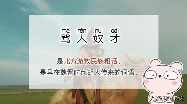 首先,“奴才”一词在春秋就已经出现了,是对待侍奉主人的下人的一种称谓。而骂人奴才是北方游牧民族粗话,是早在魏晋时代胡人传来的词语。意为无用之人,只配为奴,故又写作“驽才”。