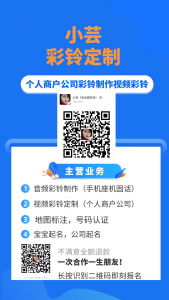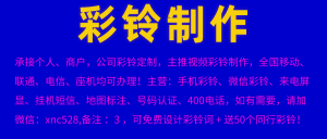 承接个人、商户,公司彩铃定制,主推视频彩铃制作,全国移动、联通、电信、座机均可办理!主营:手机彩铃、微信彩铃、来电屏显、挂机短信、地图标注、号码认证、400电话,如有需要,请加微信:xnc528 , 备注 : 3 免费做彩铃,不备注不免费 可免费设计彩铃词 + 赠送50个同行彩铃!