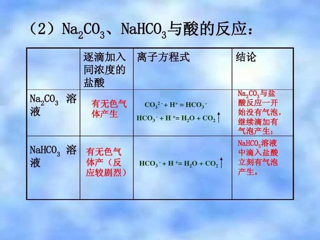 2.盐酸反应法。首先取两只相同的试管,分别加入等量的碳酸钠和碳酸氢钠粉末,往试管中滴入稀盐酸,观察两者的化学反应。我们会发现碳酸氢钠会快速产生大量的气泡,而碳酸钠出现气泡的速度就没有那么快,这是因为碳酸氢钠会马上与盐酸反应产生二氧化碳气体,碳酸钠则要先生成碳酸氢钠再产生二氧化碳气体。