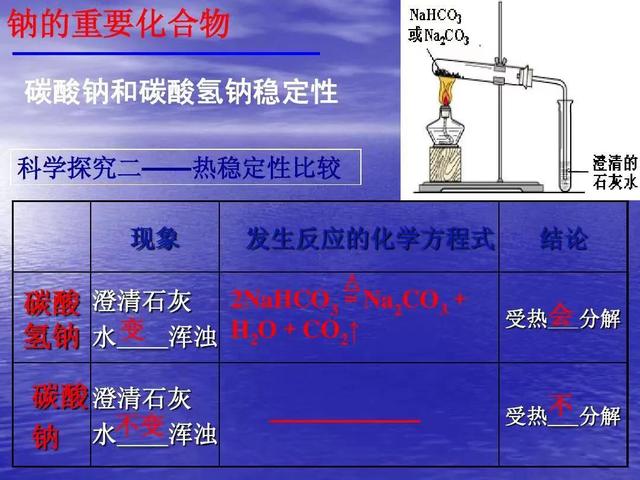 3.热稳定性法。首先取两只相同的试管,分别加入等量的碳酸钠和碳酸氢钠粉末,用带导管的橡胶塞塞住试管,导管通入有澄清石灰水的试管,再加热粉末,观察澄清石灰水的变化,石灰水变浑浊的是碳酸氢钠,不变的是碳酸钠,因为碳酸钠受热不分解,而碳酸氢钠受热易分解,产生的二氧化碳气体和石灰水反应产生碳酸钙沉淀。