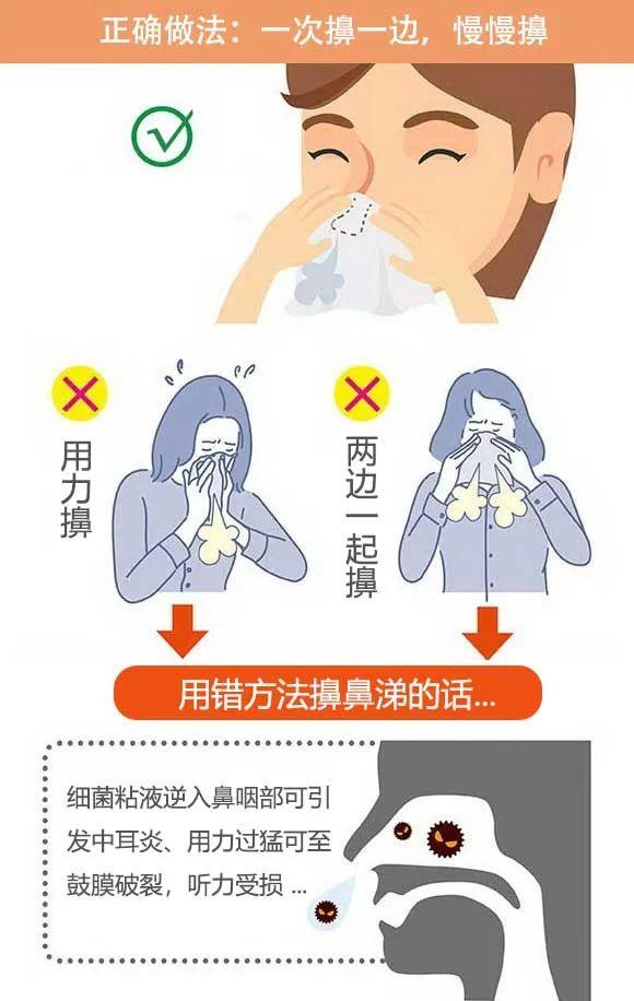 鼻塞时不可强行擤鼻,以免引起鼻腔毛细血管破裂而发生鼻出血,亦可防止带菌粘液逆入鼻咽部并发中耳炎。
