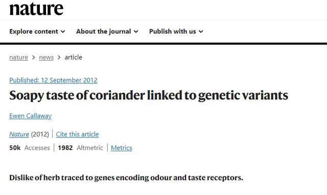 他们还发现:约一半的欧洲人染色体中有两个“OR6A2”基因,但只有15%的人说香菜有肥皂味,另有11%不携带“OR6A2”基因的人也说香菜有肥皂味。