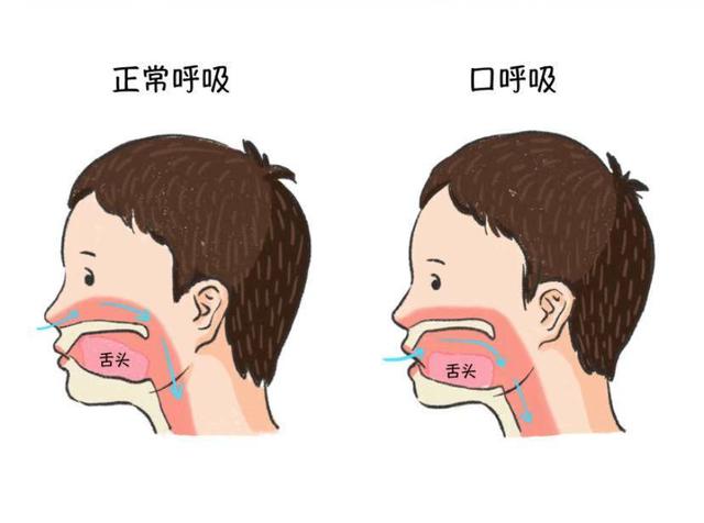 口呼吸是嘴巴呼吸,经常会无意识的张着嘴,长时间用口呼吸就会出现下巴后缩,上牙弓窄,牙齿前凸,龅牙,鼻子扁平,嘴唇没有办法包住牙齿,咬合不好,面部肌肉活动困难,缺乏表情等症状。
