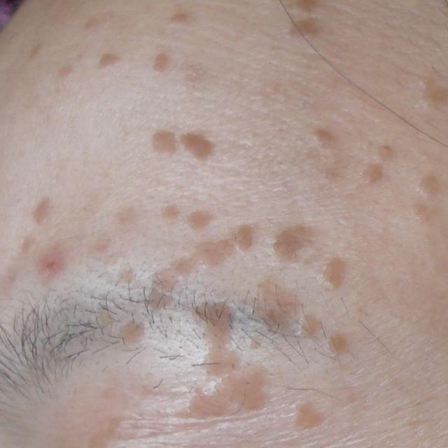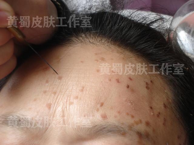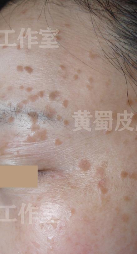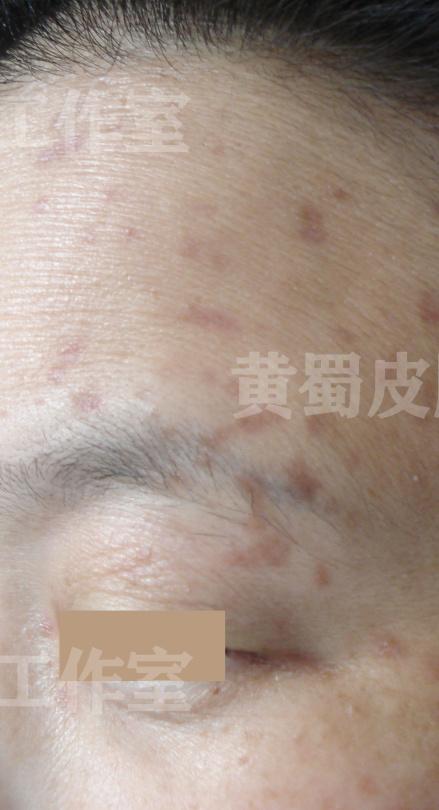 皮损表现为高出正常皮肤的扁平丘疹,米粒至黄豆大小,呈圆形至椭圆形,表面光滑,质地较硬,多为突然出现,数量较多且密集,颜色呈淡褐色,或和一般皮肤的颜色基本相同。