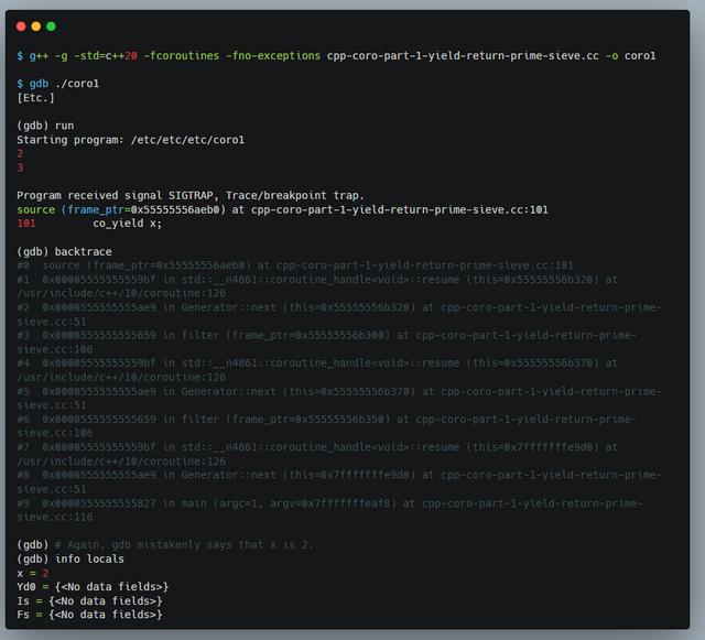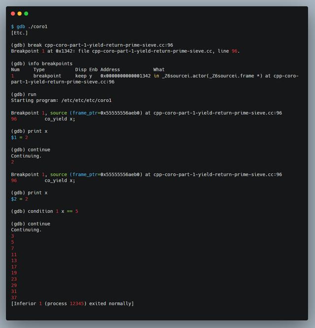 例如,我们可以co_yield x在source 协程函数中设置一个断点,但x值似乎没有改变(打印x 总是说 2)并且使断点成为条件意味着x == 5,在实践中,断点不再触发。奇怪的是,info breakpoints还将断点放在_Z6sourcei.actor(_Z6sourcei.frame *)函数中,大概是普通source(int)函数的编译器转换版本。