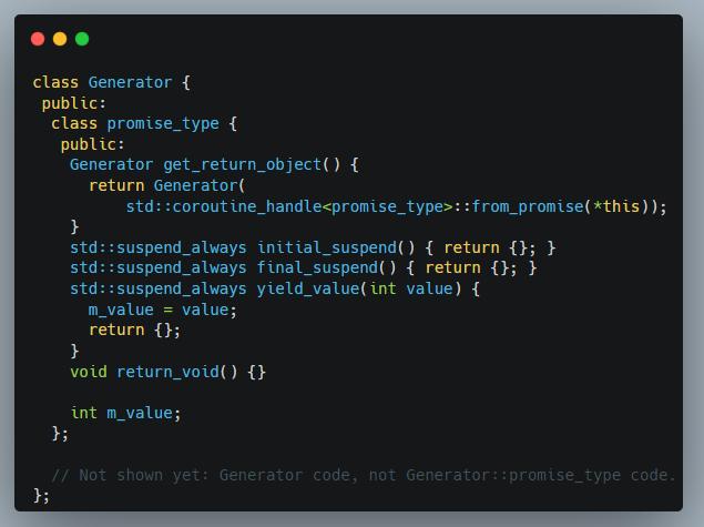 yield_value和return_void方法已经提到,yield_value将其参数保存到成员变量( 然后Generator::next将加载)。这就是生成器协程将它产生(产生)的东西传递回消费者的方式。我们的实现一次只缓冲一个值,但其他实现可以做一些不同的事情。至少,如果程序是多线程的,它必须做一些线程安全的事情。