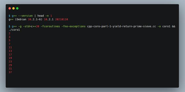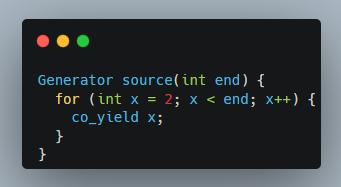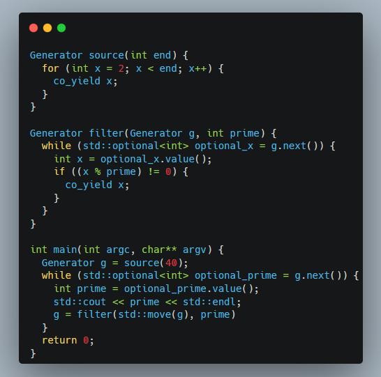 这里以素数筛选举例,但协程不一定是在 C++ 中实现素数筛选的最佳(最简单、最快等)方式。