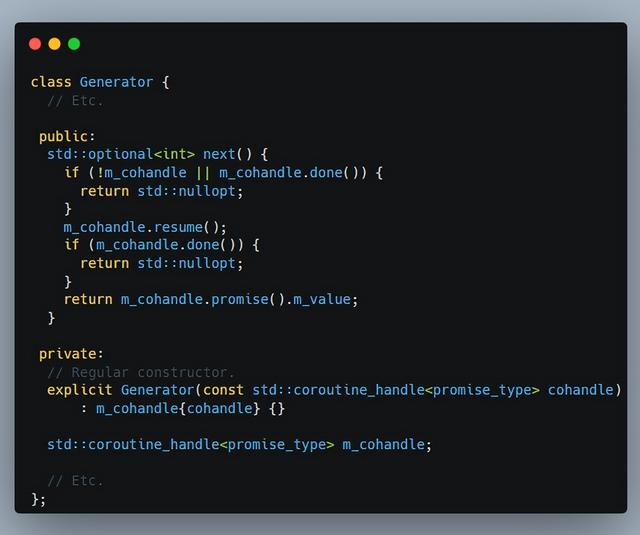 这是Generator::next方法(和Generator构造函数)。它 resume协程,运行到下一次暂停(在显式co_yield或final_suspend隐式之后co_return;后者意味着协程是done)。