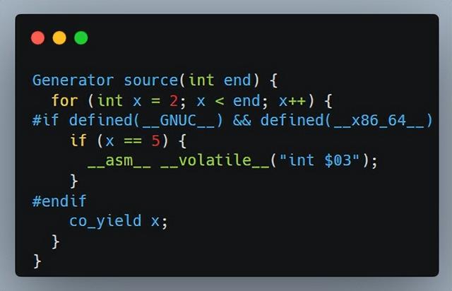 在这个例子中,source co_yields(生成)整数序列 2、3、4、5 等。因为是协程,所以在它的source末尾有一个隐式语句。co_return;其中RType, CYType和CRType分别是Generator, int 和void。