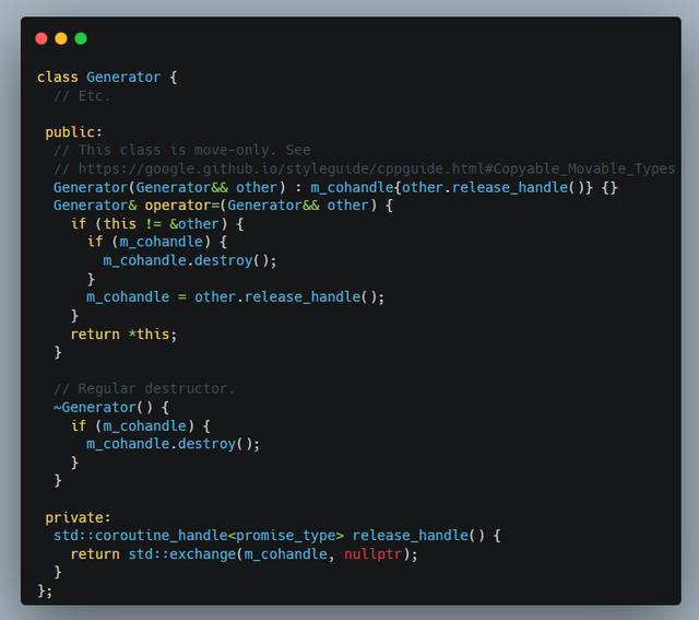 要正确清理,我们应该destroy一次std::coroutine_handle。我们将在Generator析构函数中执行此操作(并且该m_cohandle字段是私有的)。当我们将Generator从main传递给filter时,我们必须std::move它,就好像它是一个std::unique_ptr.