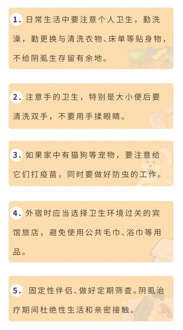 患者应剃掉感染处的毛发,目的是破坏阴虱的生长环境。另外要注意,感染者的内衣内裤、床单等都需煮沸消毒,感染期间禁性生活,若有性伴侣,也应该一同检查或治疗。