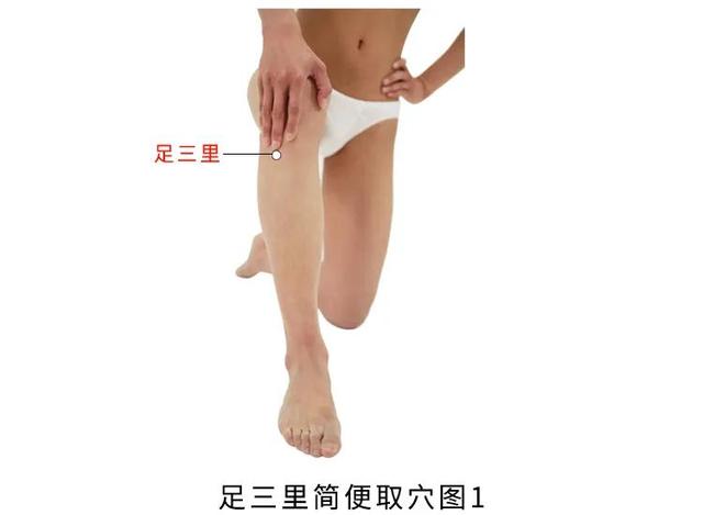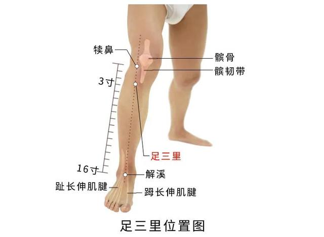 足三里穴同样是足阳明胃经上的要穴,位于外膝眼向下量4横指,在腓骨与胫骨之间,由胫骨旁量1横指处。