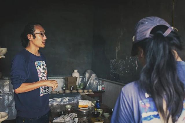 跟道长同框,大师也蓄一头长发长扎着马尾,嘴里叼着一颗烟,手上再牵着两条狗,走路带感还拉风的样子,一看就起范儿也很艺术。可是大师其实并不清高还很健谈,一听同行的老丁是考古研究院的,就主动邀请我们参观了他在山上租赁农家院子所弄的一个小窑作坊。