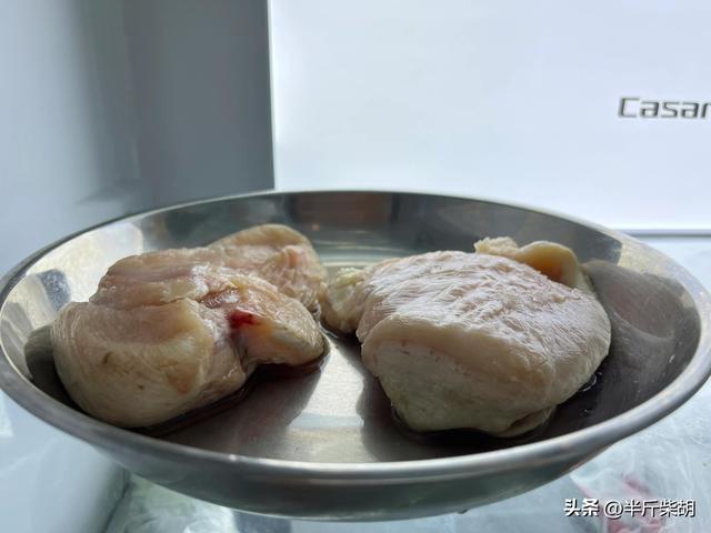首先是主材鸡胸肉,需要化冻(切记不能泡水,会影响口感);先一天晚上拿出来放到冰箱的保鲜,第二天早上即可化冻完成。