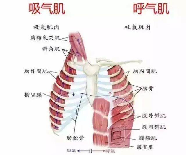 我们平常呼吸的时候,吸气时,肋间外肌、胸锁乳突肌等收缩,拉着肋骨外扩,肺部气压降低,空气被吸进来。当呼气的时候,肋间外肌、胸锁乳突肌等放松下来,肋间内肌收缩,把肋骨拉回来,肺里面的气压增大,把废气排出体外。如此循环,就实现了我们日常的呼吸动作。其实就是肌肉力量的一种组合,也就是我们日常生活中不经意的"胸式呼吸"。