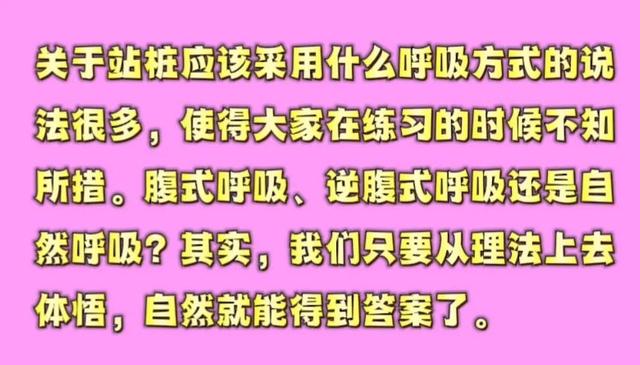 而站桩时候的呼吸用什么方式,其根本在于你身心的放松状态和你站桩时候的练习情况,呼吸只不过是为了配合你的目的的,是你练习状态的一种外在表现。所以,自然呼吸既是说的胸式呼吸,也是腹式呼吸,还可以是逆腹式呼吸,这取决于你练习的放松状态和用劲状态。我们千万不要顾此失彼,为了去练习某一种呼吸方式而丢掉了本身站桩的根本。否则的话,就是南辕北辙,缘木求鱼了。