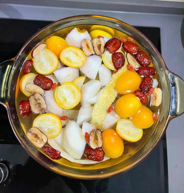 金桔对半切开,雪梨切小块(小宝宝吃建议去皮),红枣去核,除枸杞外,所以食材倒入锅中煮25分钟,起锅前5分钟再加入枸杞