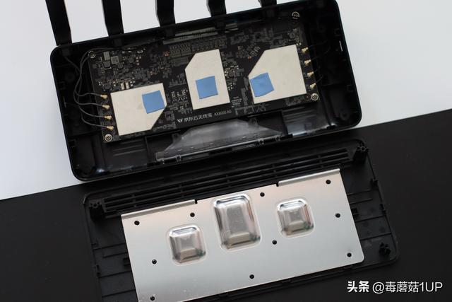 路由器背面有超大散热格栅,同时在左右两侧各有一条超宽的防滑脚垫。透过格栅可以看到里面亮闪闪的屏蔽罩,以及辅助芯片散热的铜背板。