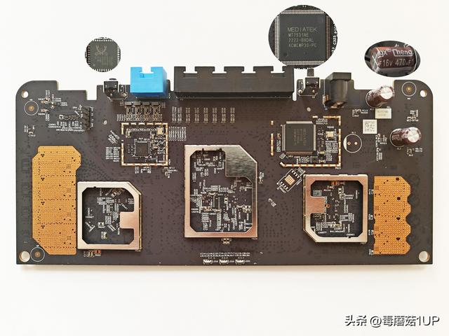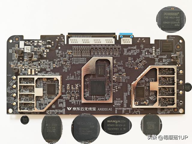 5G WiFi:联发科MT7976AN,支持4×4 mimo,频宽160MHz,理论最高速率4804Mbps,左侧四颗独立功放,型号8575HE;