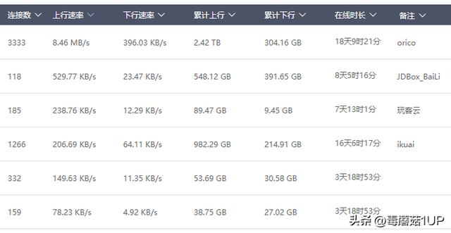 特意用ikuai终端监控查看了一下百里的上传速率,8天多一共占用了大约550G上传,差不多一天不到70G;而具体收益则是按照“95峰”计算,即:每5分钟统计一个带宽峰值,每日得到288个值,去掉高峰期中带宽数值前5%的点,取高峰期剩下的最大值。也就是说,不光需要看高峰期贡献流量,还要看单日在线时长,白天关机晚上开那肯定是不行的——这样作为一个路由器,京东云无线宝的优势就凸显出来了,毕竟家中路由器日常都是不关机的~