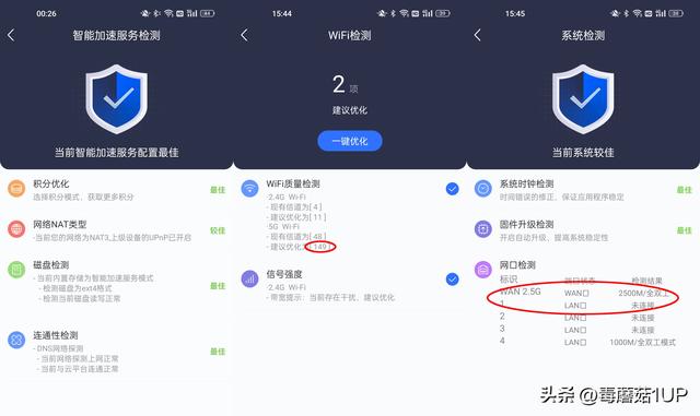另外APP上的这个检测功能,可以方便快捷的查看当前系统状态,比如信号强度、信道、网口状态等等……进而调整路由器获得更快的WiFi速度/加速服务收益/网络速度,不过呢,那个WiFi检测需要注意的一点是,如果你按照它的提示调整,会给你调整到149以上信道,而149以下从40信道开始支持160MHz(连接后显示速率2400Mbps),你按他的一键优化方案,就只能跑到80MHz,即连接速率1200Mbps。