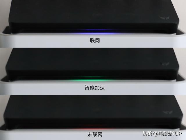 京东云百里路由器的状态指示灯在正面底部位置,通过三种不同颜色来标识不同的工作状态:其中红色代表未联网、蓝色代表已联网,绿色代表联网并且智能加速服务开启中,简单明了,日常使用中无需登录路由器后台就可以判断路由器运行状态。