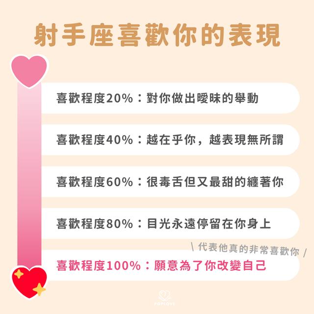 射手的喜欢和双子有点像,初期你会抓不住他们真实的想法,但随着时间的增加,他们越来越喜欢你之后,你会发现他们目光从偶尔放在你身上,转向成「只放在你身上」,而且那个转变会很有感,因为他们会直接不管不顾他人,眼里只有你,为了你改变自己是他们喜欢你的最大诚意展现~