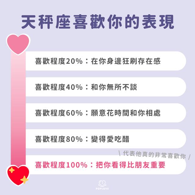 天秤座是一个内心有自己天秤的星座,他们对朋友、家人、恋爱心中都有一把尺,虽然标准是他们立定的没错,但他们会尽量让所有的关系都有一个平衡,所以随着他们喜欢的程度加深后,他们的天秤会渐渐偏向你,那就代表在他们心里,你的地位已经不可取代的重要了!