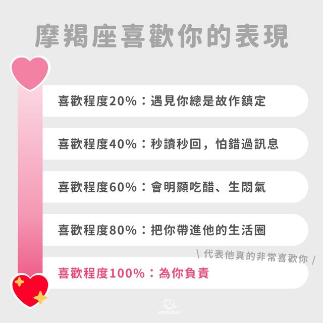 摩羯座的喜欢非常务实,他们在感情里大部分都蛮木头的,但好处是非常实际,所以他们喜欢就会表现出来、吃醋也会很明显让你知道,不太会跟你玩欲擒故纵那招,所以千万不要怀疑摩羯的真心,当他们把很多「自己」交给你时,你会非常明显能知道,他们对你的喜欢已经超过100%啦!